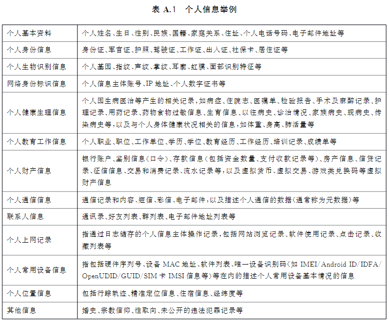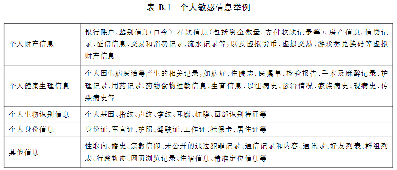 规范除了对个人信息以及敏感信息做了定义,也给出了更详细的举例
