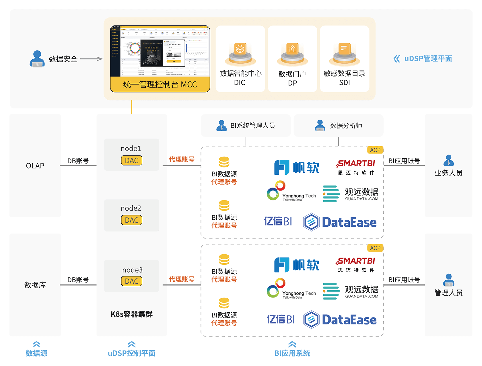 豪门国际一体化数据安全平台 uDSP 针对 BI 数据分析场景的业务和技术特点,采取“贴源保护”的技术思路,部署在 BI 应用系统和数据源中间,解耦数据安全与数据业务,给予一体化协同的敏感数据保护能力。