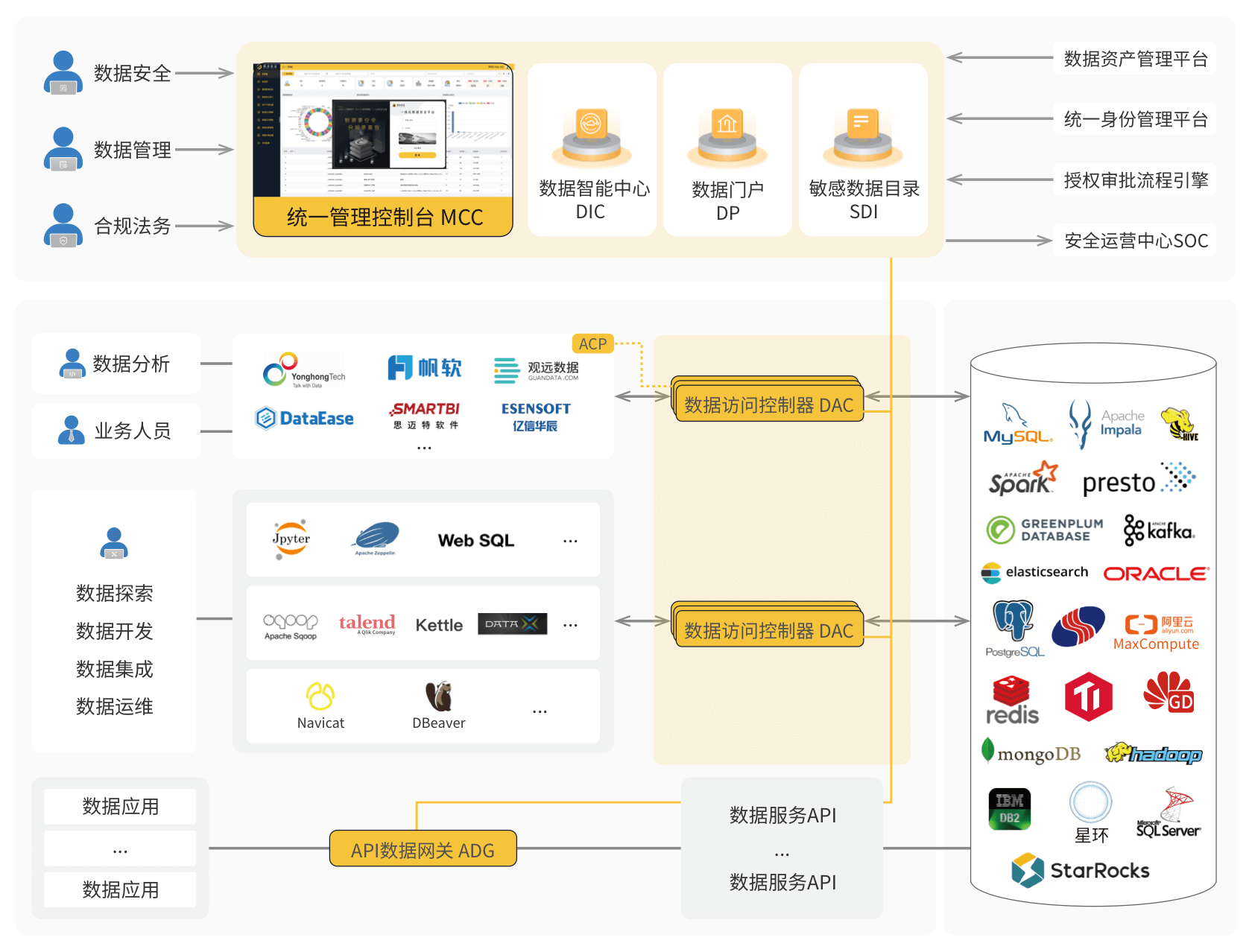 大数据相关业务在企业中的应用越来越广泛,例如业务风控、精准营销、实时报表、监管上报等,大数据部门本身也存在数据治理、数据分析、数据开发、数据集成、数据共享等多种业务场景,企业的数据使用场景变得比以往更加复杂,访问数据的人员角色也越来越多,呈现出数据大众化的趋势。大数据平台汇聚了企业的核心数据,敏感数据在不同的工具、应用和人员之间流转频繁,数据泄露和违规使用的风险越来越大,企业亟需加强大数据场景的敏感数据保护。企业的数据管理部门也面临着两难境地:一方面要快速便捷地给予数据的访问,一方面又要满足数据安全合规要求。